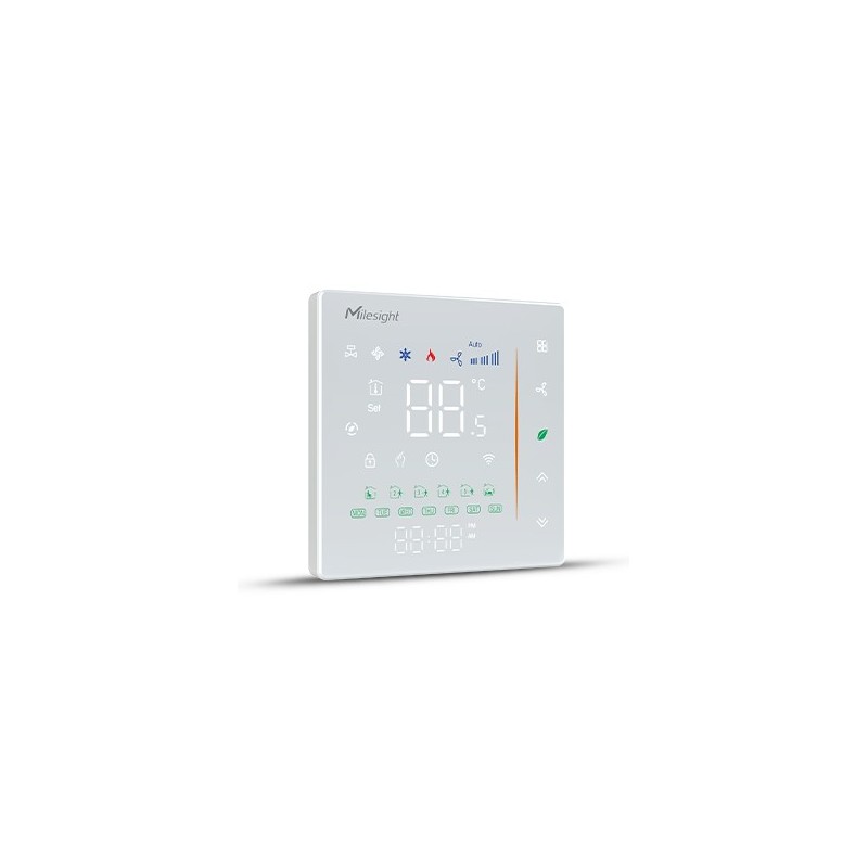 Izbový inteligentný LoRaWAN termostat WT301 môže ovládať podľa nastaveného režimu a žiadanej hodnoty teploty 3-stupňový ventilátor a solenoidový ventil (on/ff) 2-rúrkových vzduchotechnických Fan Coil jednotiek. Termostat WT301 sníma z externého alebo iného NTC snímača izbovú teplotu 5°-35°C, ktorú porovnáva s požadovanou hodnotou a na základe toho ovláda solenoidový ventil vykurovacieho/chladiaceho média klimatizácie. Vstup na pripojenie čítačky zo systému hotelových izbových kariet (pre automatické vypnutie klimatizácie pri odchode z izby a zapnutie klimatizácie pri príchode). Na termostate je možné nastaviť 3 režimy prevádzky klimatizácie (vykurovanie, chladenie, ventilácia) a výkonové stupne vetilátora (automatický, malý, stredný a vysoký). Na LCD displeji je možné odčítať aktuálny stav teploty, čas, režim prevádzky klimatizácie (vykurovanie, chladenie, ventilácia), výkonový stupeň ventilátora, stav ventilu (otvorené/zatvorené), stav bezdrôtovej LoRaWAN siete a nastavovať požadované režimy a hodnoty. Termostat je možné prevádzkovať v manuálnom alebo v automatickom časovo nastavenom regulačnom režime. Stavové údaje sa automaticky odosielajú pomocou bezdrôtovej technológie LoRaWAN do centrálneho IoT Cloudu (IoT serveru), z ktorého je možné diaľkovo spravovať a ovládať zariadenie (nastavovať požadované režimy a hodnoty). Ovládacie prvky na LCD displeji je možné manuálne (tlačidlom Lock) alebo diaľkovo uzamknúť.
