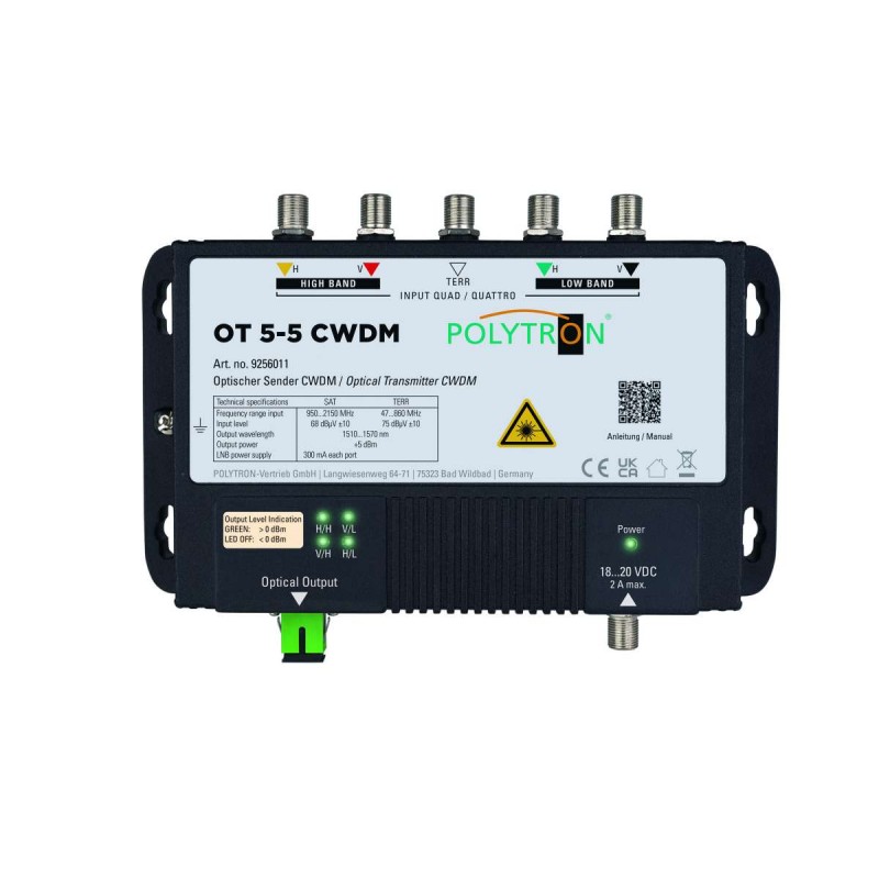 Vysielač OT 5-5 CWDM prijíma signály v rozsahu 47-2150 MHz a prevádza ich na optický signál v rozsahu 1510-1570 nm, ktorý je distribuovaný cez optickú distribučnú sieť.